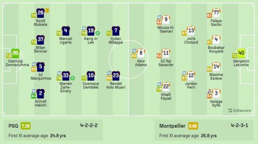 원정팀 몽펠리에는 4-2-3-1 포메이션으로 맞섰다. 원톱 아코르 애덤스와 카릴 파야드, 테지 사바니에, 무사 알-타마리가 공격진을 구성해 득점을 노렸다. 미드필드에선 조르당 페리, 조리스 쇼타르가 버텼다. 수비는 이시아가 실라, 막심 에스테베,부바카르 쿠야테, 팔라예 사코가 출격했다. 골키퍼 장갑은 벤야민 르콤트가 착용했다.