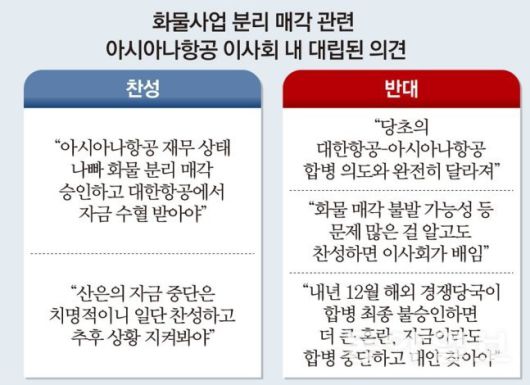 화물 분리 매각은 아시아나항공의 이사회의 찬성이 필요한 사안입니다. 아시아나항공 이사회는 총 6명입니다. 사내이사 2명 (원유석 아시아나항공 대표, 진광호 아시아나항공 전무), 사외이사 4명(박해식 한국금융연구원 선임연구원, 윤창번 김앤장 법률사무소 고문, 배진철 전 공정거래조정위원장, 강혜련 이화여대 명예교수)입니다.
