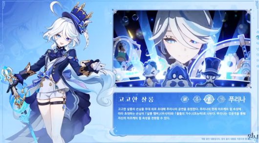 4.2 버전에서는 폰타인을 다스리는 물의 신 '푸리나'가 플레이어블 캐릭터로 추가된다. 한손검을 사용하는 5성 물 원소 캐릭터이며 '아르케의 힘' 속성 전환을 통해 원소 전투 스킬로 공격과 치유를 모두 할 수 있다.