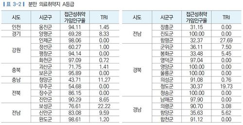 아울러 신장병 환자를 위한 인공신장실(투석실)이 있는 의료기관에 대한 접근성 취약도와 의료이용 취약지를 살펴본 결과 인천 옹진군, 강원 인제군·정선군·평창군·화천군, 전북 무주군·진안군, 전남 신안군, 경북 영양군·울릉군·청송군 등 11곳을 '인공신장실 취약지'로 분류했다.