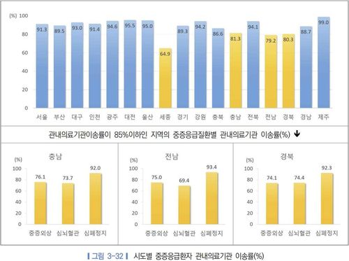 광역시도 기준으로 중증 응급환자가 관내 의료기관에 이송된 비율이 85%에 못미치는 경우도 세종(64.9%), 충남(81.3%), 전남(79.2%), 경북(80.3%) 등 4곳이나 있었다.
