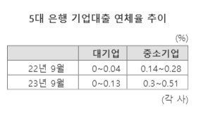 은행권은 중소기업·자영업자의 연체율이 꾸준히 오르고 있어 대출 심사를 보수적으로 나설 수밖에 없다는 입장이다. 5대 은행(KB·신한·하나·우리·NH농협은행)의 중소기업(개인사업자 포함) 연체율은 지난 9월말 0.3~0.51%로 집계돼 전년 동월(0.14~0.28%)보다 두 배 넘게 높아졌다. 대기업대출 연체율은 같은 기간 0~0.04%에서 0~0.13%로 소폭 상승한 것과 대조적이다.