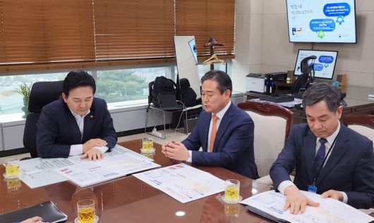 경기도 용문에서 강원도 홍천을 잇는 광역철도사업이 11월중 예비타당성조사 대상 신청을 앞두고 긴장감이 맴돌고 있다. 신영재 홍천군수(가운데)가 올 초 원희룡 국토교통부 장관(왼쪽)과 만나 용문~홍천 광역철도사업에 대해 설명하고 있다. 홍천군 제공 |