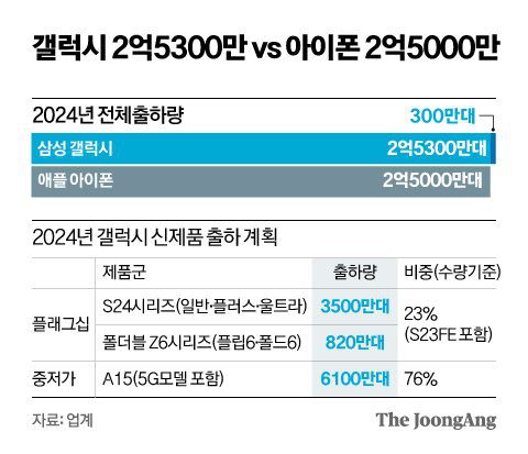 5일 정보기술(IT)·통신 업계 등에 따르면 삼성전자 모바일경험(MX)사업부는 갤럭시S24를 포함한 갤럭시폰의 내년 생산(출하량)을 총 2억5300만 대로 최근 확정했다.