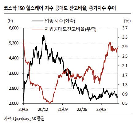 2차전지 업종 다음으로 공매도 비중이 가장 높은 업종인 제약·바이오 주가가 긍정적일 것으로 이 연구원은 내다봤다. 그는 “코스피200 헬스케어 지수는 1.43%, 코스닥150 헬스케어 지수는 2.85%를 기록 중”이라며 “코스닥150 헬스케어 지수 구성 종목들의 대다수가 바이오텍으로 신약 개발 기업 특성 상 실적에 따른 밸류에이션보다는 수급에 민감한 만큼 실적주 중심의 코스피200 헬스케어 지수 대비로도 특히 공매도 영향이 크다”고 진단했다.