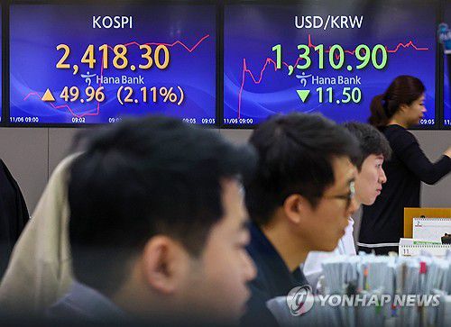 이날 오전 9시 30분 현재 코스피는 전 거래일보다 50.46포인트(2.13%) 오른 2,418.80이다.