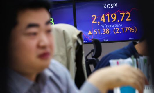 6일 오전 9시 55분 기준 코스피는 전 거래일 대비 62.12p(2.62%) 오른 2430.46를 기록하고 있다. 이날 지수는 전 거래일보다 31.46p(1.33%) 오른 2399.80에 개장했다.