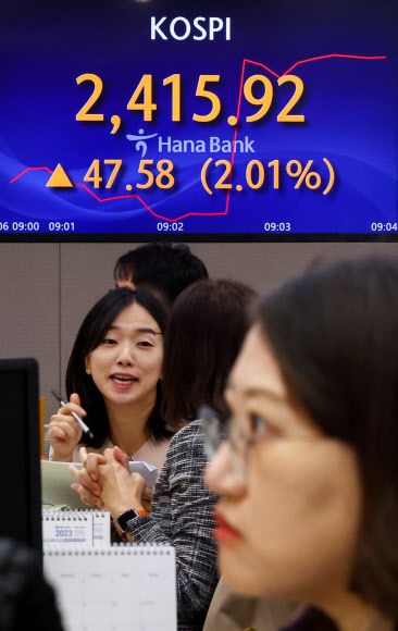 코스피와 코스닥 지수도 나란히 상승세다. 같은 시각 코스피는 전 거래일보다 3.37% 오른 2447.95, 코스닥지수는 4.86% 오른 820.07이다.