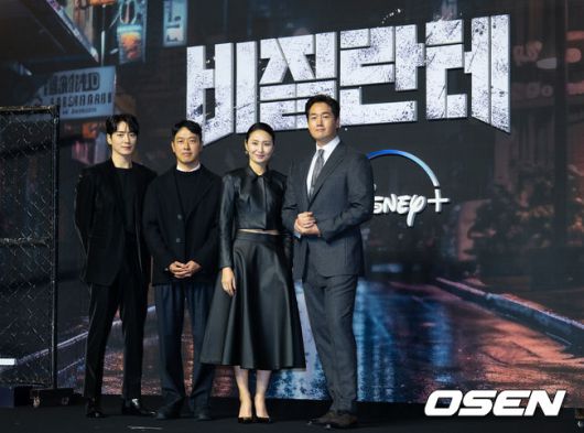 [OSEN=김성락 기자] 6일 오전 서울 강남구 그랜드 인터컨티넨탈 서울 파라나스에서 디즈니+ 오리지널 시리즈 '비질란테' 제작발표회가 열렸다. 배우 이준혁, 최정열 감독, 김소진, 유지태가 취재진을 향해 포즈를 취하고 있다. 2023.11.06 / ksl0919@osen.co.kr