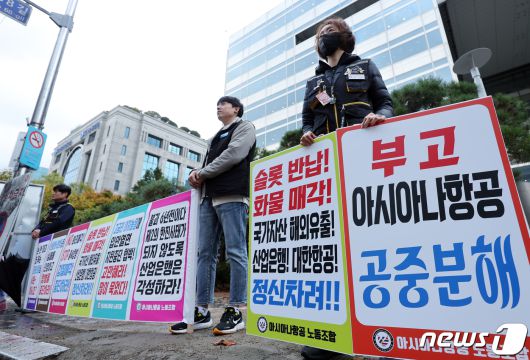 (서울=뉴스1) 박정호 기자 = 아시아나항공 노동조합 관계자들이 6일 오전 서울 여의도 KDB산업은행 후문 앞에서 화물사업 매각 규탄 집회를 하고 있다. 아시아나항공 이사회는 지난 2일 이사회를 통해 대한항공과의 기업결합 전제조건의 하나로 떠오른 화물사업부 매각안에 동의 여부를 논의한 결과 아시아나항공 화물사업부 매각 방안을 가결했다. 2023.11.6/뉴스1