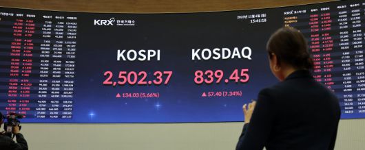 (서울=뉴스1) 박지혜 기자 = 공매도 금지 첫날인 6일 오후 서울 여의도 한국거래소 홍보관 전광판에 코스피와 코스닥 지수가 나타나고 있다. 이날 코스피와 코스닥은 각각 5.66%, 7.34% 급등세를 보이며 마감했다. 코스피는 전 거래일(3일)보다 134.03포인트(5.66%) 오른 2,502.37에 장을 마쳤고, 코스닥은 7.34% 상승한 839.45에 장을 마쳤다. 2023.11/6/뉴스1 /사진=뉴스1화상 |