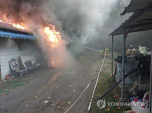 (영월=연합뉴스) 6일 오후 강원 영월군 영월읍 연하리 한 아동복지시설 조립식 건물에서 불이 나 소방 당국이 진화 작업을 벌이고 있다.