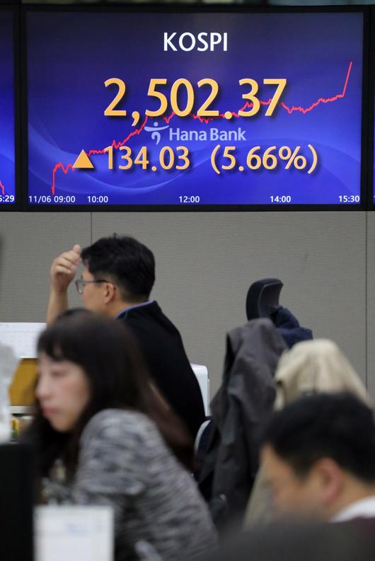 6일 한국거래소에 따르면 이날 코스피지수는 전 거래일 대비 5.66%(134.03포인트) 오른 2502.37에 장을 마쳤다. 상승 폭 기준으로 역대 최고다. 직전 최고치(2020년 3월 24일 127.51포인트)를 3년 반 만에 갈아치웠다.