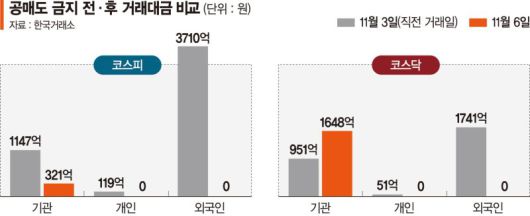 코스닥시장의 기관 공매도 거래대금은 1648억원으로, 공매도 전면금지 이전인 이달 2일(506억원), 3일(951억원)의 약 2배에 달했다.
