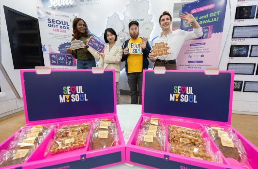 6일 서울 중구 명동관광정보센터에서 외국인들이 서울관광재단과 편의점 CU가 공동 개발한 과자 선물세트인 ‘서울과자’를 소개하고 있다. 한국 전통 간식인 약과와 강정으로 구성됐으며 CU 35개 지점에서 판매한다. 가격은 1만7000원. 뉴스1 ⓒ 동아일보 & donga.com, 무단 전재 및 재배포 금지