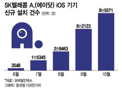 6일 앱 통계분석 플랫폼 모바일인덱스에 따르면 지난 10월 iOS(아이폰 등 애플 단말기 운영체제) 기기에서 에이닷을 신규 설치한 건수는 8만5571건으로 지난 6월(3548건) 대비 24배 수준으로 늘었다. 에이닷 설치건수는 7월 1만5345건, 8월 2만8463건에 불과했지만 아이폰 통화 녹음 기능 출시가 예고된 지난 9월(6만2123건)부터 신규 설치 건수가 크게 늘었다.