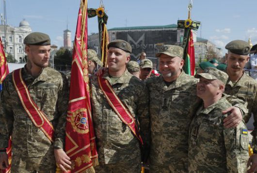 발레리 잘루즈니(왼쪽 셋째) 우크라이나군 총사령관이 지난 8월 24일 키이우 성 소피아 광장에서 열린 독립기념일 행사에서 장병과 사진을 찍고 있다. EPA=연합뉴스 |