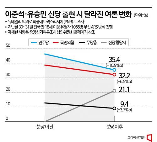 보수 성향을 내세운 이·유 신당이 등장하면 일단 발등에 불이 떨어지는 것은 국민의힘이다. 지난해 대통령 선거에서 국민의힘은 보수층의 결집과 20·30세대의 결합을 통해 승리를 거둘 수 있었다. 하지만 이 전 대표의 선택에 따라 지지층의 상당수가 이반할 수 있는 것이다.