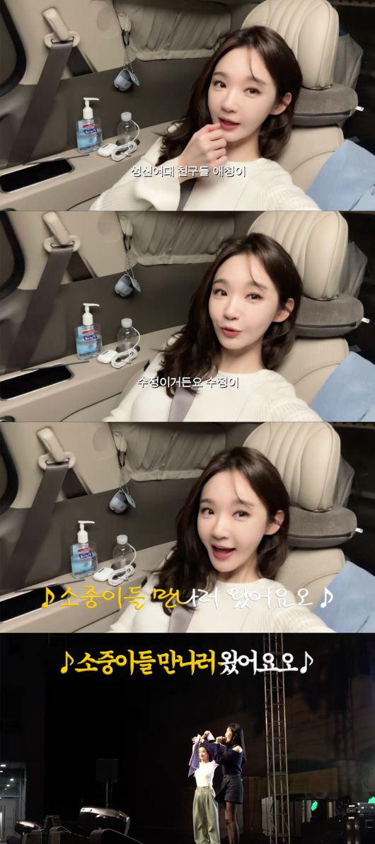 이날 강민경은 멤버 이해리와 함께 성신여대 축제를 방문했다. 무대를 마친 강민경은 “오늘 어떤 일이 있었는 줄 아냐. (성신여대)학생들 애칭이 수정인데, 언니가 소중이라고 했다”고 폭로했다.
