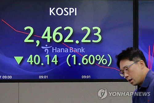 7일 오전 9시 36분 현재 코스피는 전 거래일보다 37.55포인트(1.50%) 내린 2,464.82이다.