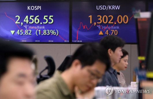 [파이낸셜뉴스] 국내 증시가 외국인과 기관의 매도세에 하루 만에 약세로 돌아섰다. 코스피 지수는 2%대 하락하며 2450선을 내어줬고, 코스닥 지수는 등락을 보이다 하락세로 전환했다.