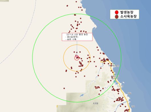 6일 강원 고성군 간성읍 한 한우농가에서 럼피스킨병이 발생했다. 사진은 발생 농장 지도. 강원특별자치도 제공 |
