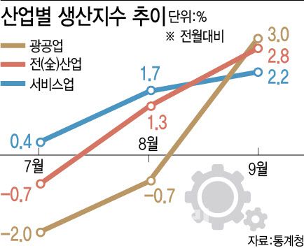 KDI는 지난달에 이어 이번 달에도 경기 부진이 반도체 산업을 중심으로 완화되는 신호가 나타나고 있다고 분석했다. 9월 전산업생산은 전월(1.3%)보다 높은 2.8%의 증가율을 기록했다. 광공업생산(3.0%)은 반도체가 23.7%로 전월(8.4%)보다 대폭 증가했다. 또 지난해 철강 생산 감소에 따른 기저효과로 1차 금속이 전월(-1.8%)에서 12.5%로 반등하며 부진이 완화됐다. KDI는 “제조업 평균가동률은 73.2%로 전월에 이어 높은 수준을 기록했다”며 “재고·출하 비율도 전월(124.3%)보다 10.4%포인트 하락한 113.9%로 제조업이 점차 회복하는 모습”이라고 평가했다.