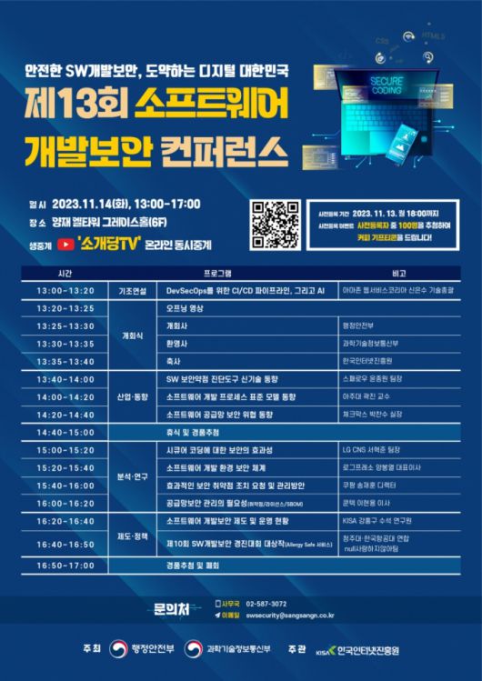 KISA(한국인터넷진흥원)는 14일 서울 양재동 엘타워에서 과학기술정보통신부, 행정안전부와 함께 '제13회 소프트웨어 개발보안 컨퍼런스'를 개최한다.