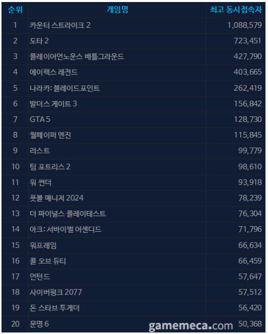 ▲ 11월 7일 오후 12시 기준 일 최고 동시접속자 TOP 20 (자료출처: 스팀) |