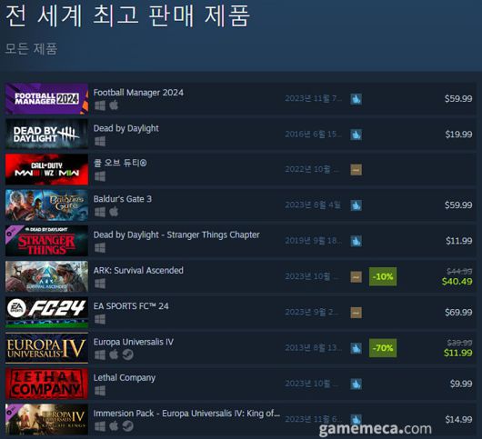 그 외에는 유로파 유니버셜리스 4 신규 DLC 킹 오브 킹즈가 출시되어 본편과 DLC가 각각 8위, 10위를 차지했다. 그리고 풋볼 매니저 시리즈 최신작 풋볼 매니저 2024가 7일 출시와 함께 1위에 올랐다.