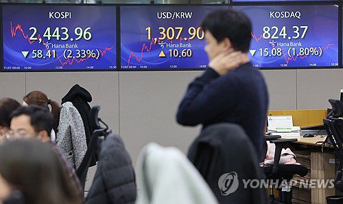 이날 코스피 종가는 전장보다 58.41포인트(2.33%) 내린 2,443.96으로 집계됐다.