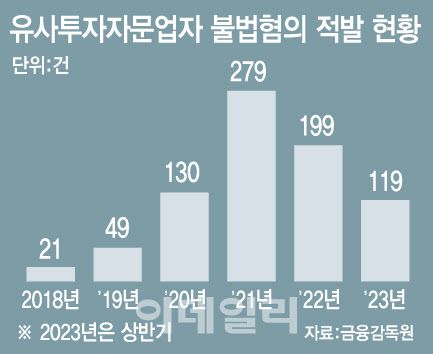 7일 금융감독원이 강훈식 더불어민주당 의원에 제출한 ‘유사투자자문업자 불법혐의 연도별 적발 현황’에 따르면 올해 상반기 적발된 유사투자자문업 불법 혐의 건수는 119건에 이른다. 이는 금감원 자산운용검사국이 민원·점검 등을 통해 경찰에 수사 의뢰한 유사투자자문업자 현황을 집계한 것으로 이 수준을 유지하면 역대 최다 수준에 이를 수 있다는 분석이 제기된다.
