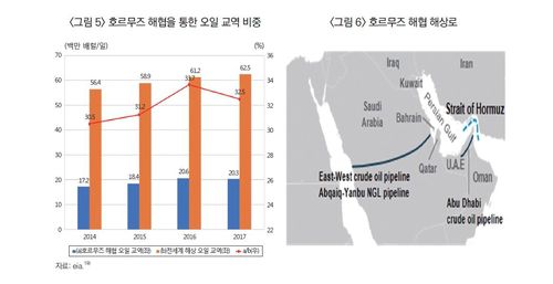 호르무즈 해협을 통한 오일 교역 비중(왼쪽) 및 호르무즈 해협 해상로(오른쪽) |
