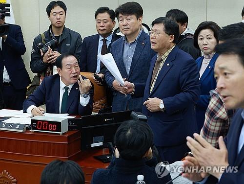 민주당 설훈 의원은 의사진행발언에서 "야당 위원들이 위원장실에서 회의하고 있었는데 그러면 기다려줘야 하는 것 아니냐"며 "위원장의 일방 독재"라고 비판했다.