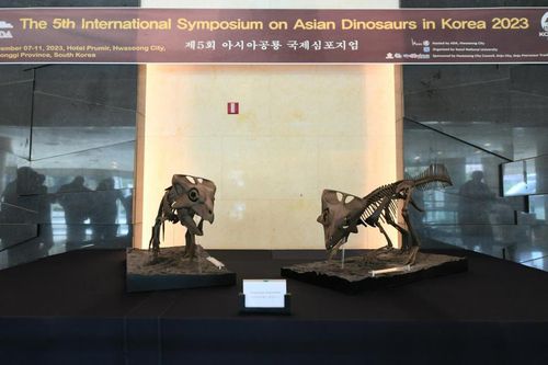 화성시는 이날부터 11일까지 푸르미르호텔에서 열리는 '제5회 아시아공룡 국제심포지엄'에서 한국 뿔공룡 코리아케라톱스의 전신 골격 레플리카(복제품) 2점을 공개했다.