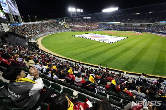 [서울=뉴시스] 황준선 기자 = 지난 7일 서울 송파구 잠실야구장에서 열린 2023 KBO 포스트시즌 한국시리즈 1차전 LG 트윈스와 KT 위즈 경기에 앞서 개막 행사가 진행되고 있는 모습. 2023.11.07. hwang@newsis.com |
