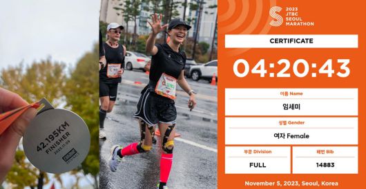 끝으로 지난해 4시간 15분 58초 기록으로 풀코스 마라톤을 완주한 사실을 공유하며 2년 연속 완주에 성공했음을 인증했습니다.