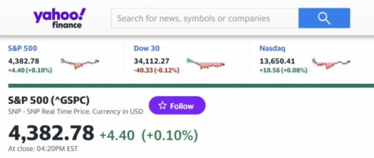 8일(현지시간) 뉴욕증시에서 다우존스(DJIA) 지수는 전일보다 40.33(0.12%) 내린 34,112.27을 기록했다. 그러나 S&P 500 지수는 4.4포인트(0.1%) 상승한 4,382.78에 거래를 마쳤다. 나스닥은 10.56포인트(0.08%) 올라 지수는 13,650.41에 마감했다. 나스닥은 9거래일째 올랐다.