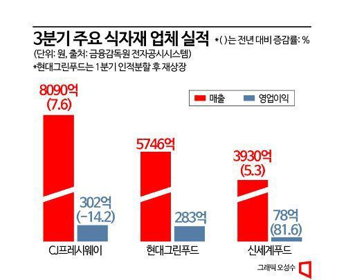 지난 3월 인적분할된 신설법인인 현대그린푸드는 연결 기준 올해 3분기 매출액이 5746억원, 영업이익이 283억원으로 잠정 집계됐다. 분할 전인 작년 3분기 회사 실적을 부문별로 재산출해 비교한 결과 올 3분기 매출은 작년 동기보다 7.0% 늘었고, 영업이익은 20.1% 증가한 수준이다. 앞서 지난 3일 실적을 발표한 신세계푸드도 매출액이 3930억원으로 5.3% 늘었고, 영업이익은 78억원으로 81.6% 증가했다.