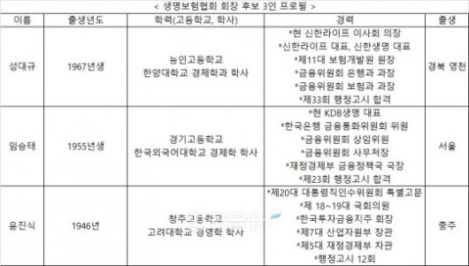 현재 생명보험협회장 후보로는 성대규 신한라이프 의장, 임승태 KDB생명 대표, 윤진식 전 산업자원부 장관이 거론되고 있다.