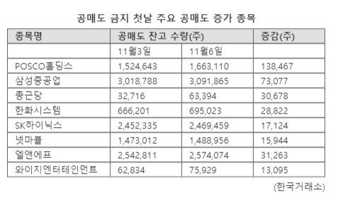 그러나 공매도 전면 금지에도 일부 종목들은 공매도 잔고가 증가한 것으로 나타났다. 포스코홀딩스의 공매도 잔고는 금지 직전이었던 3일 152만4643주에서 6일 166만3110주로 늘어났다. 코스피 시장에서 공매도 잔고 수량이 가장 많이 오른 종목 1위에 해당한다. 공매도 금지 첫날 주가 상승으로 평가금액이 늘면서 포스코홀딩스의 공매도 잔고액(잔고수량x종가)도 6677억원에서 8681억원으로 30%나 뛰었다.