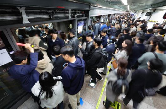서교공에서 파트타임으로 일하는 박모(80대)씨는 질서 유지를 위해 빨간 봉을 들고 시민들에게 진행 방향을 안내하면서 “평소에도 사람이 많지만, 피크타임이 아닌데 오늘은 좀 더한 것 같다”고 말했다. 강남역에서 40분간 기다린 끝에 열차에 탑승한 원유아(23)씨는 “아침에도 5시 반에 나왔는데 집에 갈 때도 시간이 오래 걸릴 것 같다”며 “체감상 금요일 퇴근길보다 더 복잡한 것 같다”고 토로했다. 1호선 서울역에서 오후 5시45분 출발 예정이던 인천행 열차는 19분이 지난 6시4분에야 출발했다.