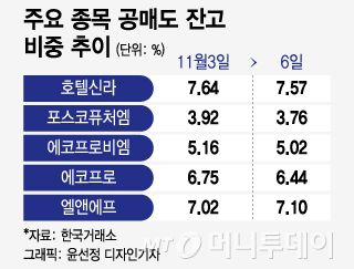 코스피 시장에서 지난 3일 공매도 잔고 비중이 7.64%로 1위였던 호텔신라는 6일 주가가 5.85% 상승했는데, 잔고 비중은 7.57%로 0.07%포인트 줄었다. 포스코퓨처엠은 가격제한폭까지 올랐지만 공매도 잔고 비중은 3.92%에서 3.76%로 0.16%포인트 줄었다.