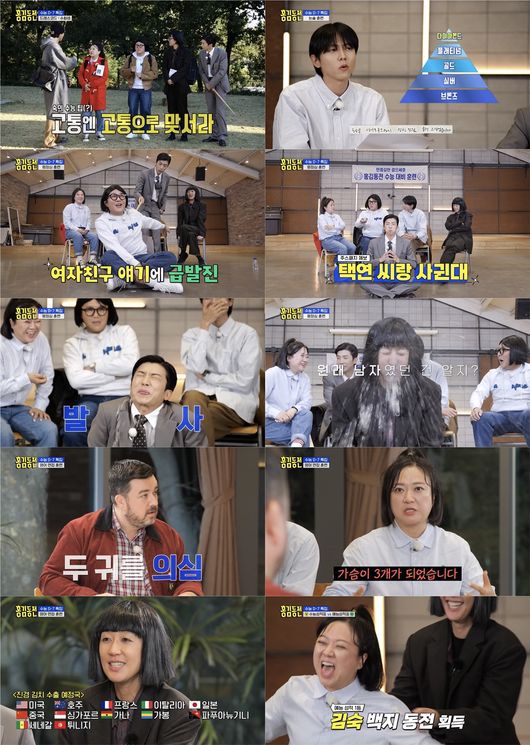2교시 평정심 훈련에서는 뒷담화 게임이 진행됐다. “기본 자세가 조평정이야. 거의 흔들림이 없어”라며 자신만만했던 조세호는 홍진경의 여자친구 발언에 발끈했고, “여자친구가 20살 연상이래”라고 한 김숙과 “환갑 잔치는 했네”라는 주우재의 말에 점점 구체화되는 여자친구의 정보와 고꾸라진 주식 상황에 결국 물을 뿜었다.