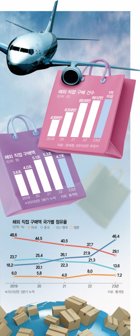 10일 관세청에 따르면 2020년 5000만 건을 돌파하며 6358만 건을 기록한 해외 직구 건수는 지난해 9612만 건으로 1억 건에 육박했다. 올해는 1억 건 돌파가 유력시된다. 구매 건수가 늘어나면서 구매액도 불어나고 있다. 2021년 5조 원대에 올라선 구매액은 2년 만인 올해 6조 원대에 진입할 것으로 관측된다. 통계청에 의하면 3분기까지 누적 구매액이 4조 7928억 원에 달한다는 점, 광군제와 블랙프라이데이로 4분기 구매액이 다른 분기에 비해 높다는 점 등이 이 같은 관측에 힘을 싣고 있다.