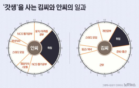 안 씨는 올해로 공기업 준비 2년 차다. 9시가 되면 그의 하루가 시작된다. 그의 하루 일과는 '공부'로 가득 채워져 있다. 오전 9시부터 다음날 3시까지 숨 쉴 틈 없이 공부 일정이 채워져있다. 두 번의 식사 시간과 운동시간 1시간이 그에게 주어진 유일한 휴식 시간이다. 그는 취업 관련 공부에만 하루에 약 12시간을 쏟아붓는다.