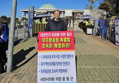 (사천=연합뉴스) 박정헌 기자 = 경남에서 우주항공청 특별법 통과를 촉구하는 여론이 확산하는 가운데 사천시의회도 13일 국회의사당 앞에서 릴레이 1인 시위를 벌였다.