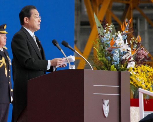 기시다 후미오 일본 총리가 지난 11일 자위대 공군 사열 행사에서 연설하고 있다. UPI연합뉴스 |