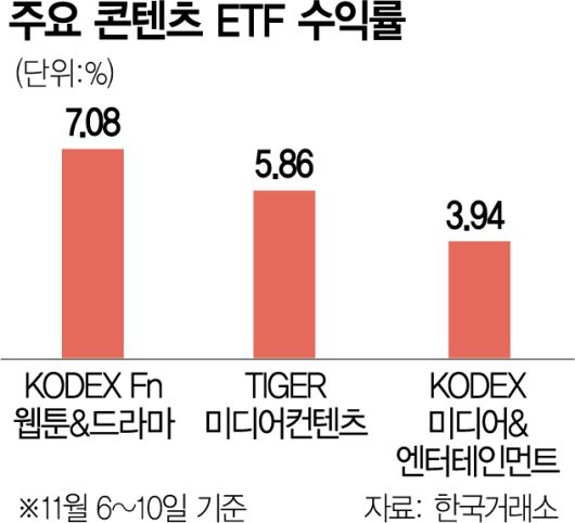 13일 한국거래소에 따르면 최근 일주일간(11월 6~10일) ‘KODEX Fn웹툰&드라마 ETF’는 7.1%의 수익률을 기록했다. ‘TIGER 미디어컨텐츠(5.9%)’와 ‘KODEX 미디어&엔터테인먼트(3.9%)’ 역시 준수한 수익률을 나타냈다. 이들 ETF는 같은 기간 코스피 상승 폭(1.7%)을 크게 웃돌았다. 다만 차익 실현 매물 등이 출현해 ‘KODEX Fn웹툰&드라마 ETF’는 이날 2.5% 하락하는 등 콘텐츠 ETF들이 약세를 보였다.