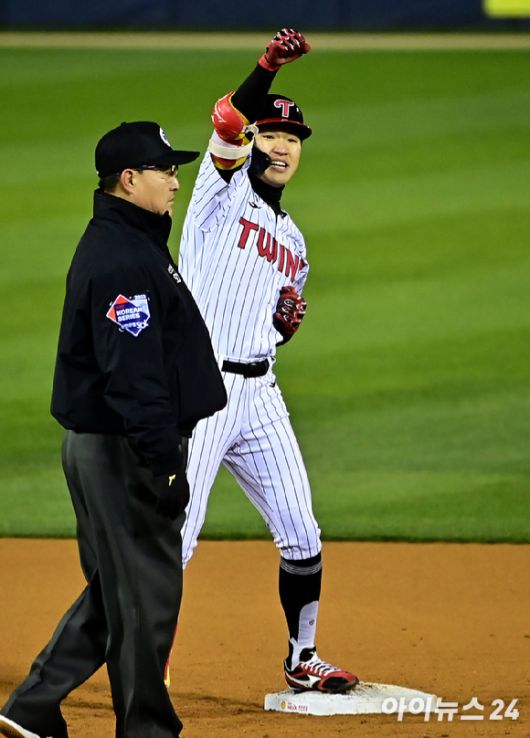 13일 오후 서울 잠실야구장에서 열린 '2023 KBO 포스트시즌' LG 트윈스와 KT 위즈의 한국시리즈 5차전 경기가 열렸다. 3회말 1사 2,3루 LG 박해민이 2타점 적시 2루타를 때린 뒤 기뻐하고 있다. [사진=곽영래 기자] |